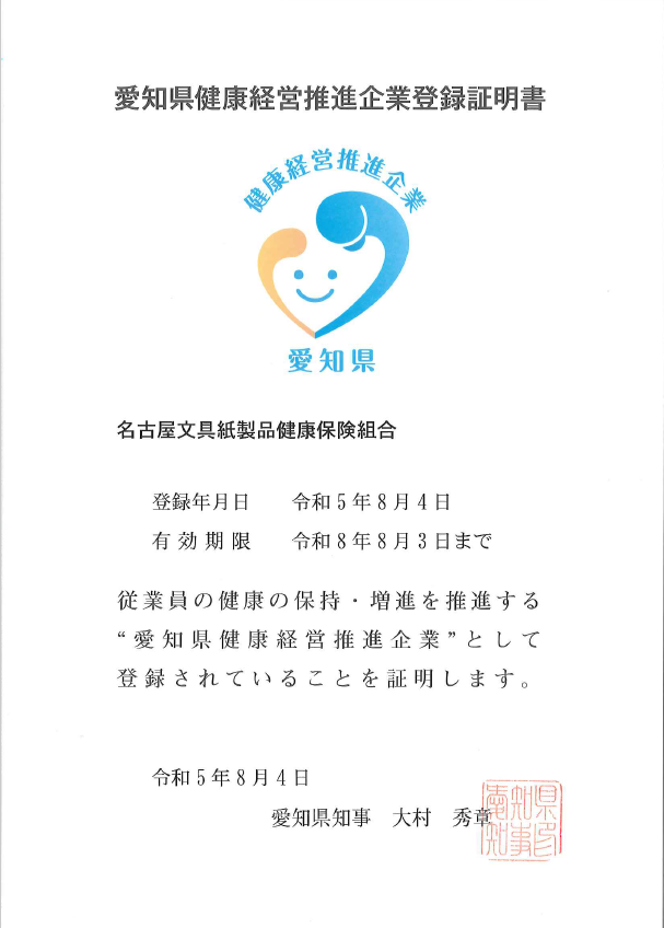 愛知県が健康経営を推進する企業・団体を認定している「愛知県健康経営推進企業」に、当健康保険組合が認定されました。