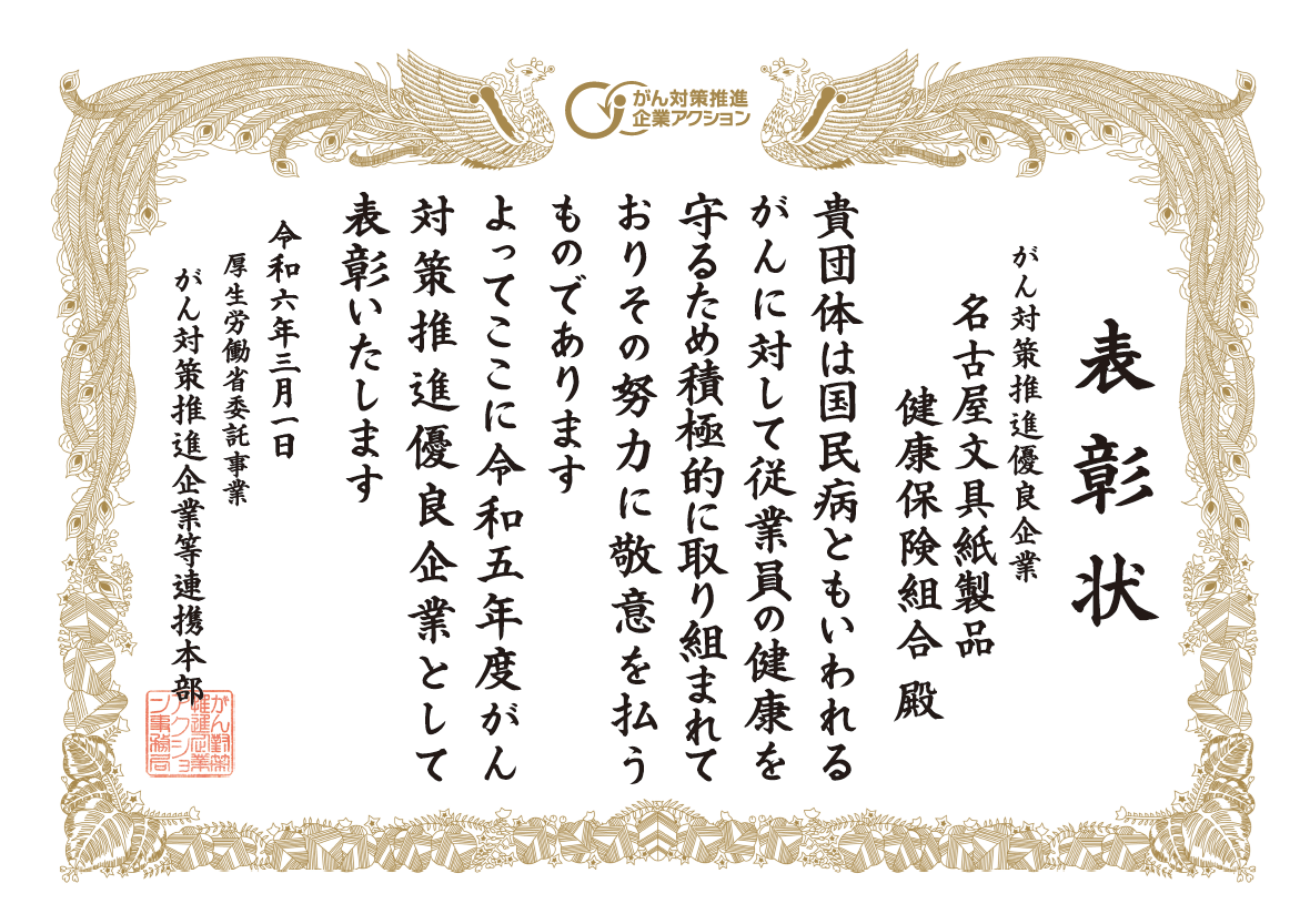 厚生労働省・がん対策推進企業アクション事務局が認定している「令和5年度がん対策推進優良企業」に、当健康保険組合が認定されました。