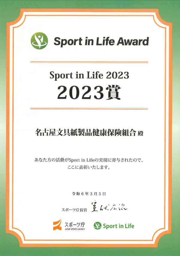 スポーツ庁が認定している「Sports in Lifeアワード2023」を、当健康保険組合が受賞しました。